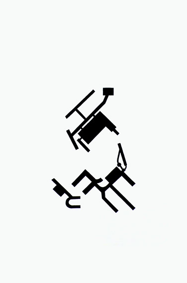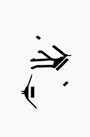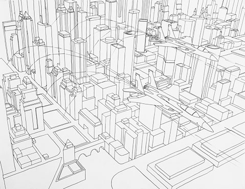 A l’encre de Chine, quatorze dessins d’aérogares réalisés suivant le modèle des plans d’orientation distribués aux usagers. Sur chaque dessin, absence de toute information pratique ou signalétique. Alain Declercq collectionne les plans des aéroports dans lesquels il passe, les étudie et opère une sorte de caviardage en y masquant toute information. Ces plans défonctionnalisés deviennent ainsi cryptogrammes.