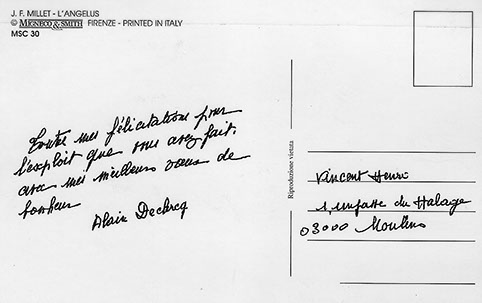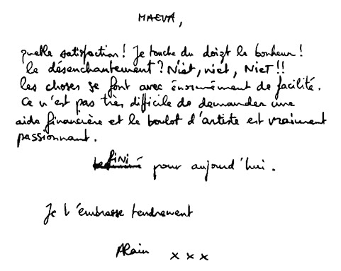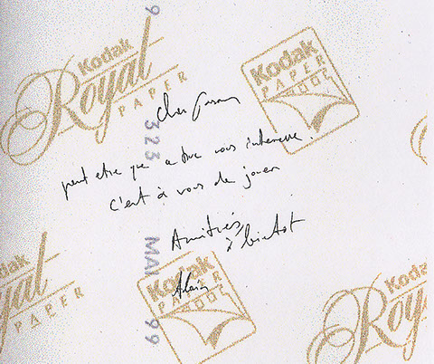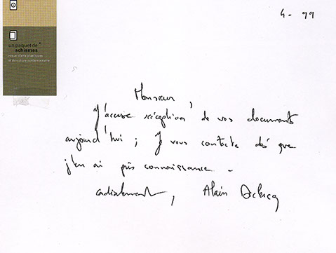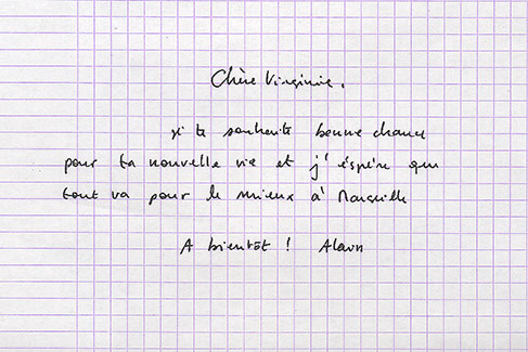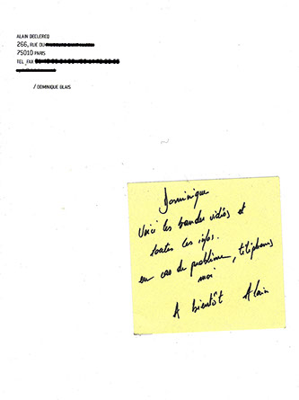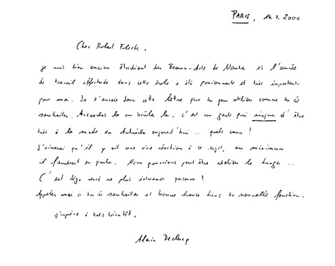 Série de courriers adressés à des correspondants en réponse à une lettre manuscrite envoyée par ceux-ci. Alain Declercq réutilise alors pour leur répondre, la typographie, la mise en page, la syntaxe et le ton adoptés par les correspondants dans leur premier courrier. Chacune des lettres écrites étant disséquée et paramétrée, une typographie informatique est créée et peut être utilisable à l'aide d'un clavier. "Faux en écriture" est le fruit d’une technique de composition offrant un potentiel de falsification important.