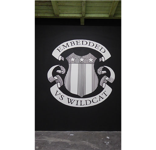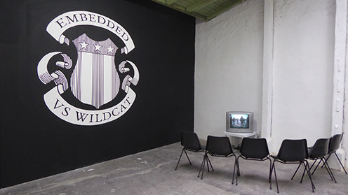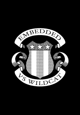 Relecture du blason américain orné d’une part de "embedded", terme désignant les journalistes de guerre placés sous protection d’une unité combattante, et d’autre part de "wildcat", terme désignant les journalistes de guerre indépendants. Dessin exécuté de multiples fois, dans différents formats. C'est l’image réconciliée d’une distorsion majeure entre des récits journalistiques dont les conditions de réalisations apparaissent trop rarement à l’image. Il existe une version "tirée" de Embedded VS Wildcat.