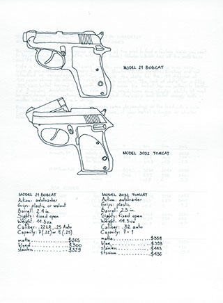 Fac-similé de la revue internationale publiée annuellement par Beretta et recensant la totalité des armes à feu disponibles dans le commerce. Ci-contre, huit reproductions de la pièce.