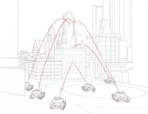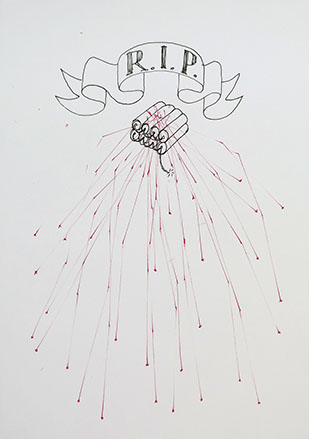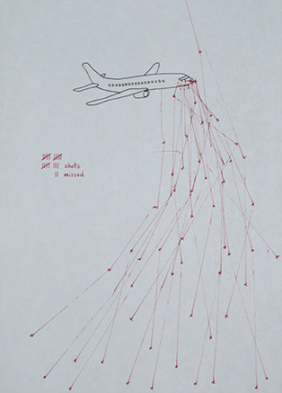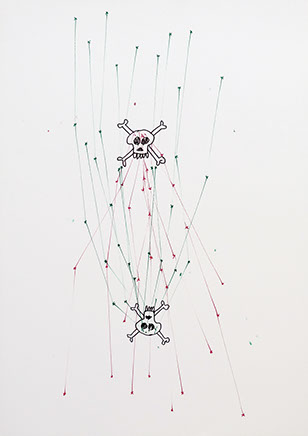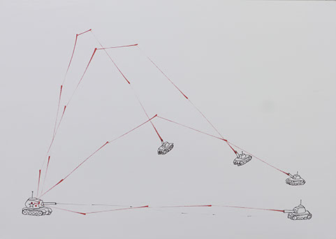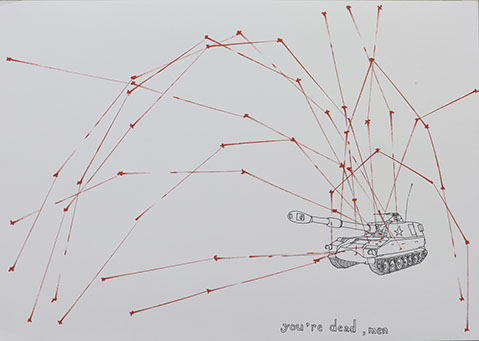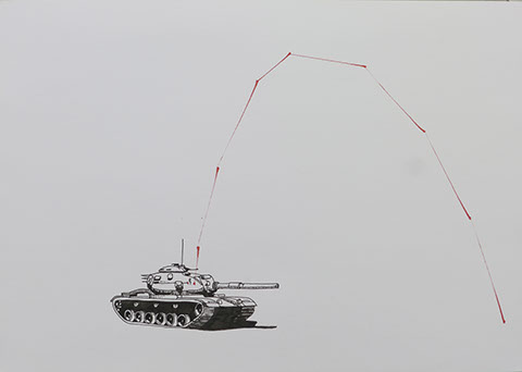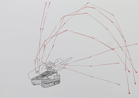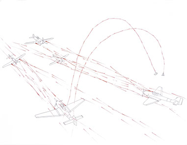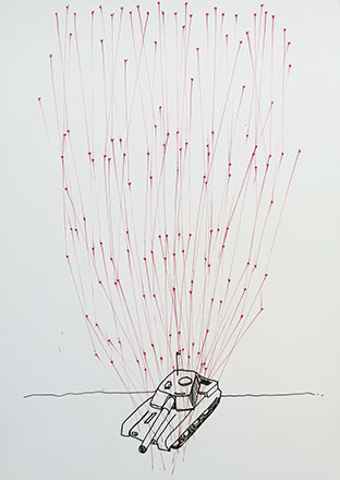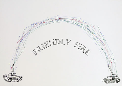 Série de dessins réalisés par projection d’un stylo sur une feuille. Reprise, hors contexte, de la technique d’un jeu d’enfant, petit jeu de guerre inoffensif et jouissif.
