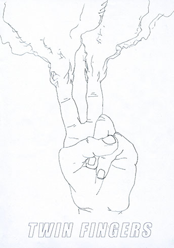 Dessin d’une main dont l’index et le majeur dessinent le V de la victoire ou miment l’image des tours jumelles en feu.