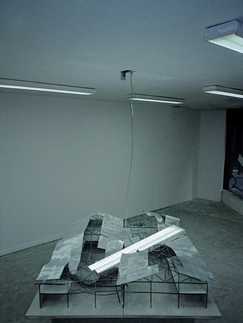 Maquette d’un bâtiment industriel partiellement détruite par la chute d’un néon. "Fin" est le résultat plastique d’une destruction consécutive à la chute d’un néon lesté provoquée durant le vernissage de l’exposition de l'artiste à Toulouse, alors que les visiteurs avaient le dos tourné. Elle fut conçue peu de temps après l’explosion de l’usine A.Z.F. du 21 septembre 2001.