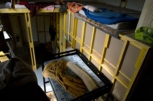 Bois, placo, mobilier, fausse cheminée et moteur, lits et vêtements épars.