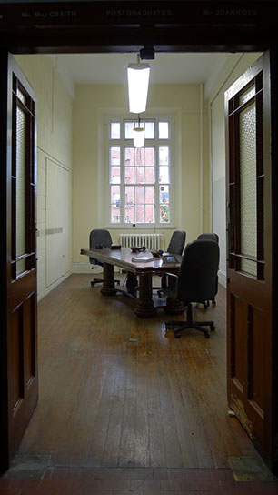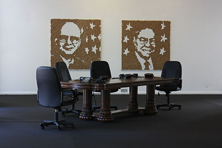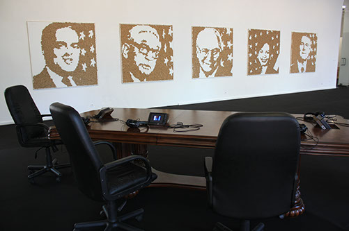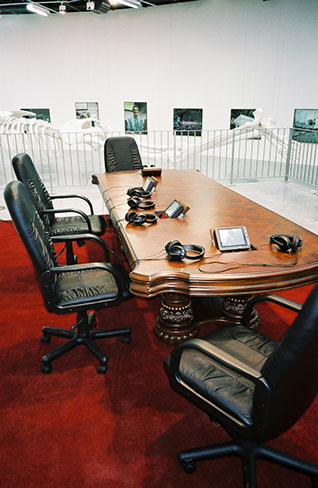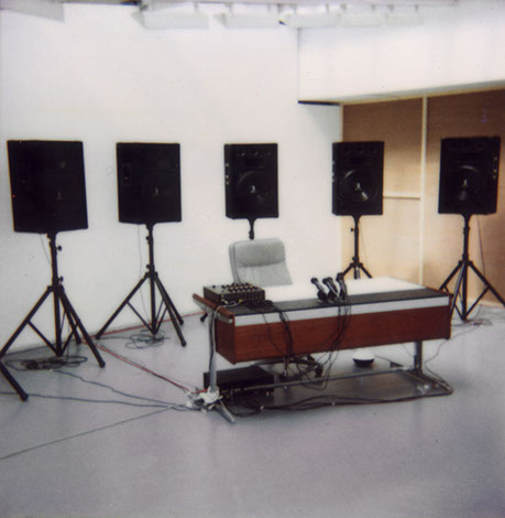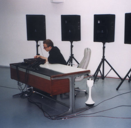 Installation sonore constituée de six micros dirigés vers six enceintes positionnées derrière le bureau. Les larsens produits lors de la mise sous tension des appareils rendent impossible toute prise de parole dans cet espace oratoire. "Feed back / Mikrophon" est un instrument de musique permettant de transformer le larsen, son intensité comme sa qualité, par la manipulation de la table de mixage.