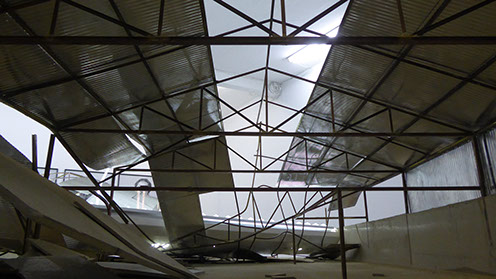 Maquettes de pavillons disposées dans un grand bassin d’eau boueuse. Reconstitution d’une vue aérienne d’inondation dont le plan de ville prend la forme de la lettre F, ce qui fit croire à certains qu’était ici symbolisée la France, mais ce qui s’avère une citation du langage aéronautique selon lequel la lettre F dessinée au sol signifie une situation de détresse.