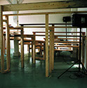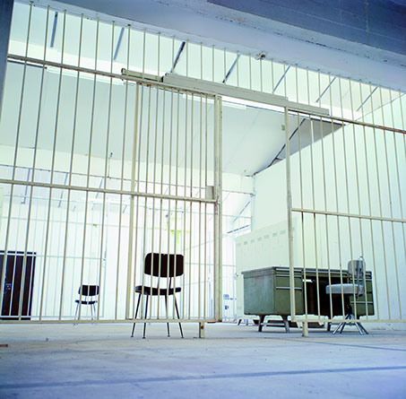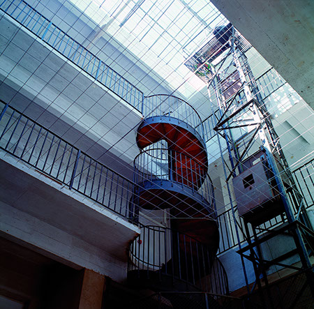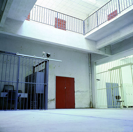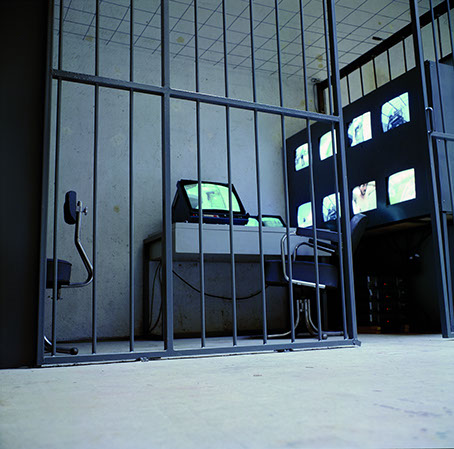 Reconstitution d’un espace carcéral dans la salle d’exposition Transpalette de Bourges. "Panoptique" a servi de décor au film Escape, évasion restituée en huit séquences diffusées, le temps de l’installation au Transpalette, sur les huit moniteurs présents dans la fausse cabine de surveillance.