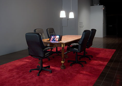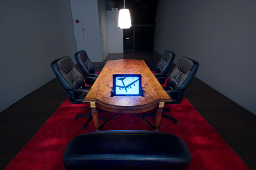 Bureau typique de l’administration américaine dont le plan de travail est percé de quatre trappes présentant chacune un moniteur vidéo. Diffusion de quatre films d’Alain Declercq sur chacun des moniteurs : Mike, État de siège, PHB ITV, Feedback / Pentagon, films énigmatiques présentés sur le mode du secret dévoilé.