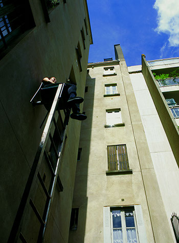 Chaise soudée sur une échelle de six mètres de haut présentée dans la cour intérieure d’un immeuble de Paris.