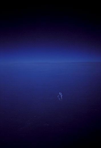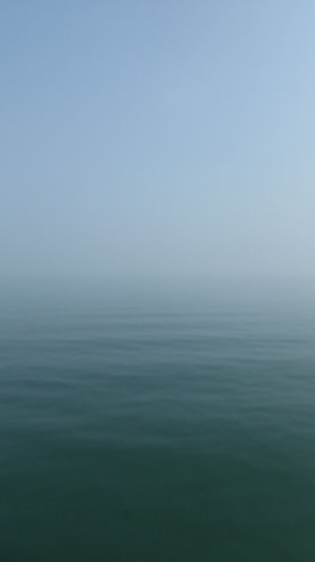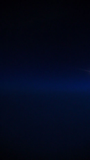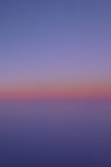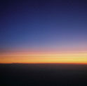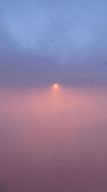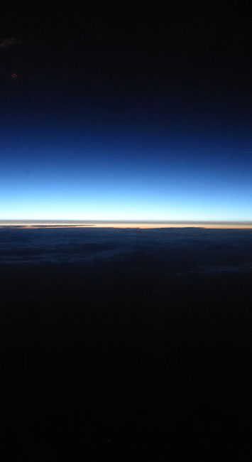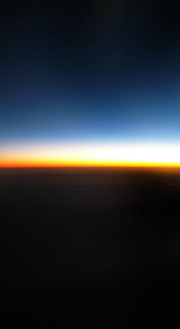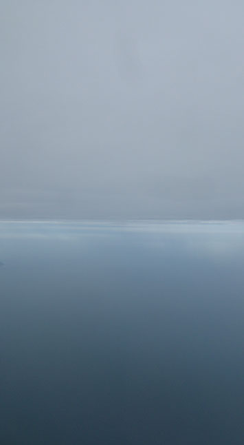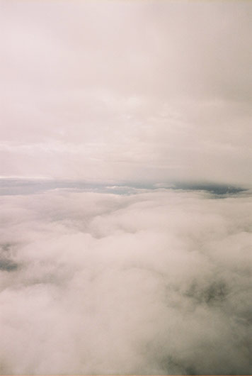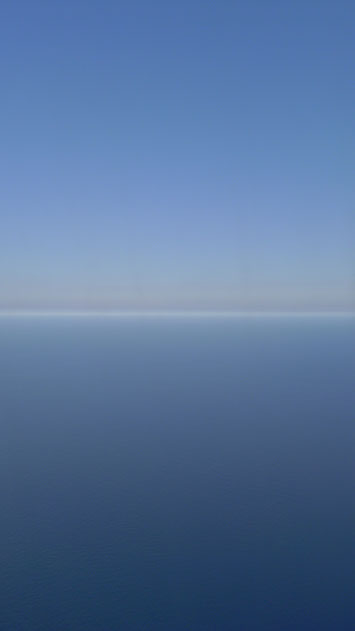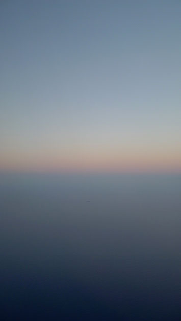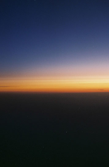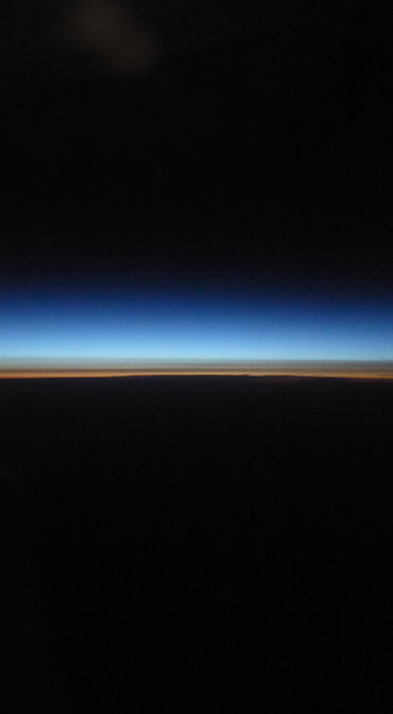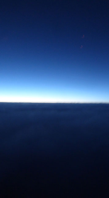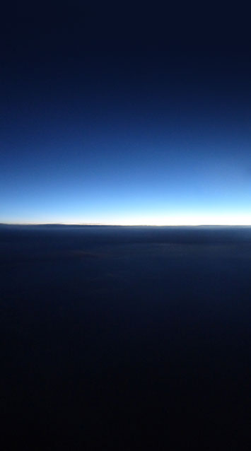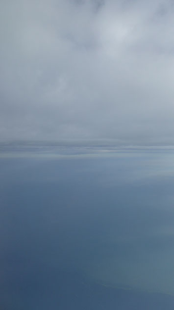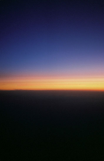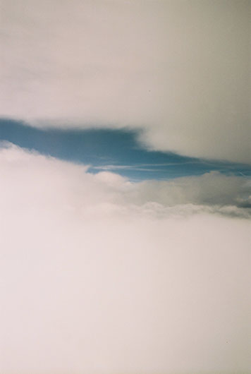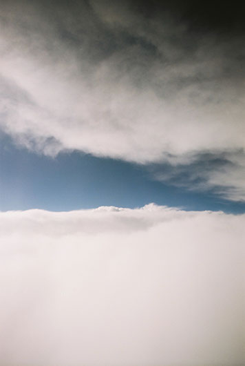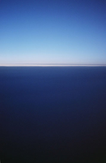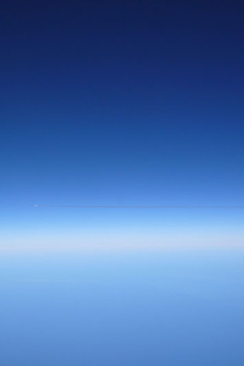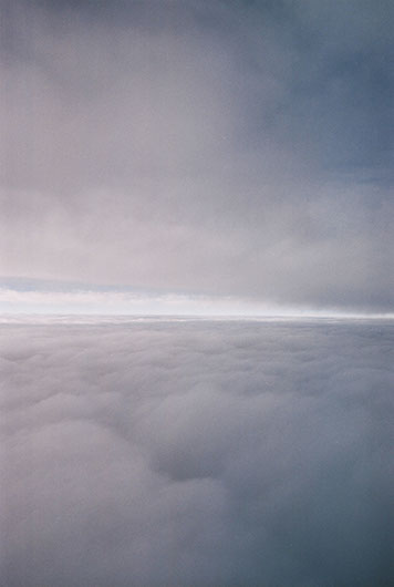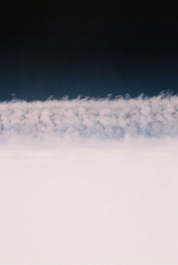 Vue aérienne montrant ciel et terre distingués par une fragile ligne d’horizon et, au premier plan, une énigmatique volute de fumée blanche.