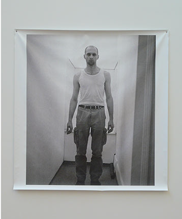 Autoportrait à deux mains gauches. Photographie manifeste pour marquer ses distances par rapport à la figure héroïque de l’artiste engagé. Alain Declercq a produit cette pièce alors qu’il commençait à s’intéresser de près aux questions d’autorité et de politique sécuritaire, réalité le conduisant à interroger son statut d’artiste dans le champ du politique.