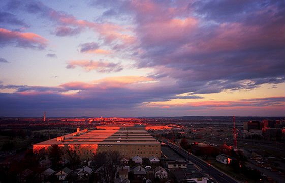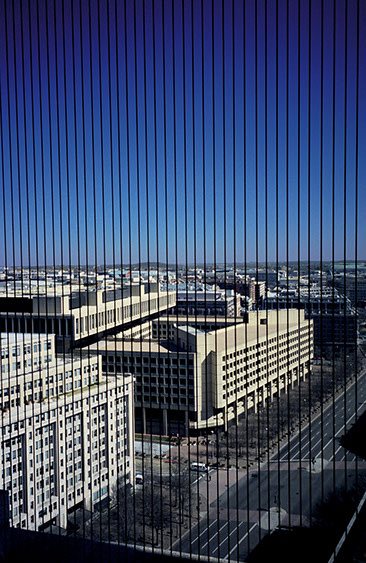 Photographie non autorisée du siège du F.B.I. prise à travers la grille du clocher de l’ancienne gare de Washington D.C. Cette image présente, derrière des barreaux, un des centres de recherche criminelle les plus puissants du monde.