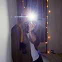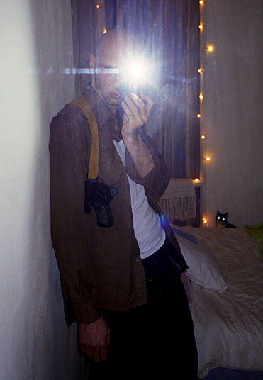 Autoportrait à demi masqué par un reflet lumineux. Photographie réalisée pour une exposition présentant toutes les pièces relatives à Mike en 2005