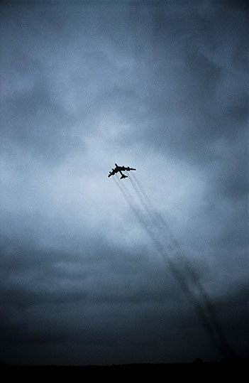 Image d’un B 52 en vol partant bombarder l’Irak. Photographie prise à proximité de l’aéroport de Fairford en Grande Bretagne, base avancée des États-Unis durant le conflit au Moyen Orient. Alain Declercq a pris cette image quelques minutes après avoir réalisé la pièce B 52.