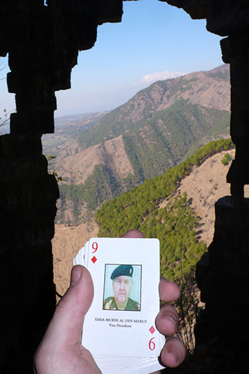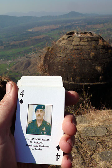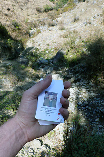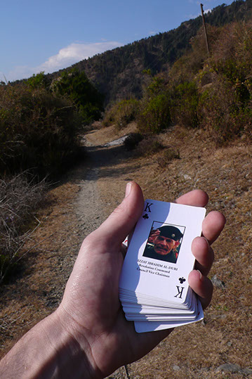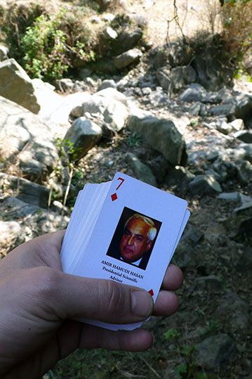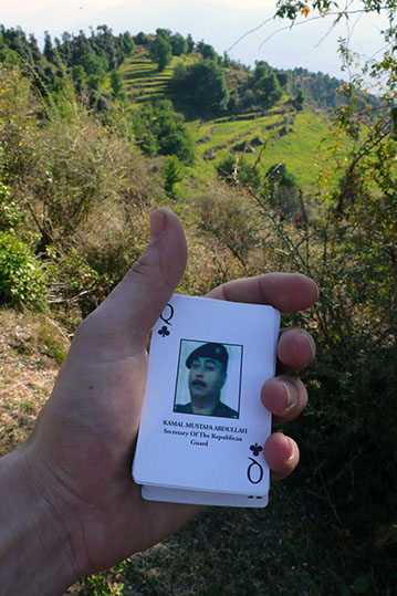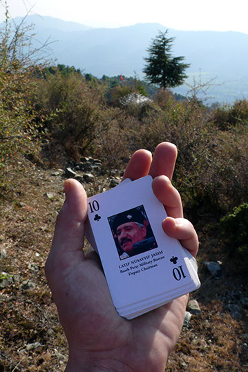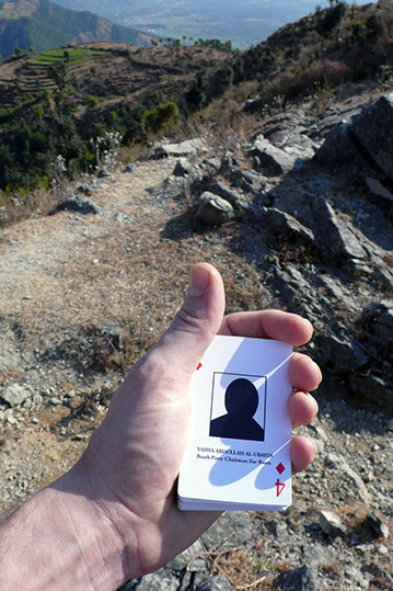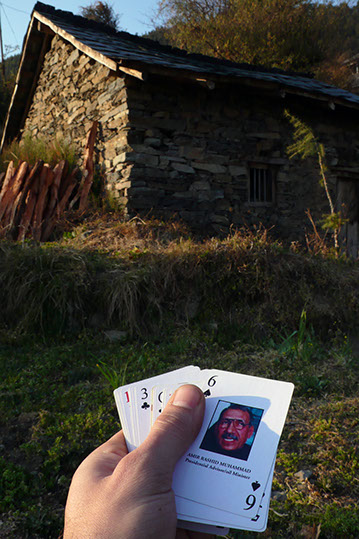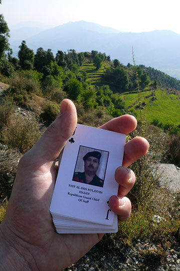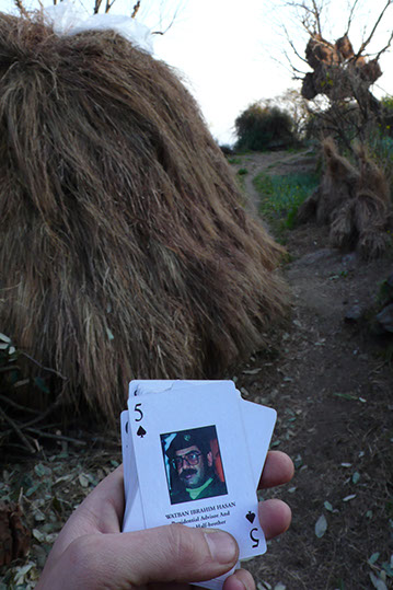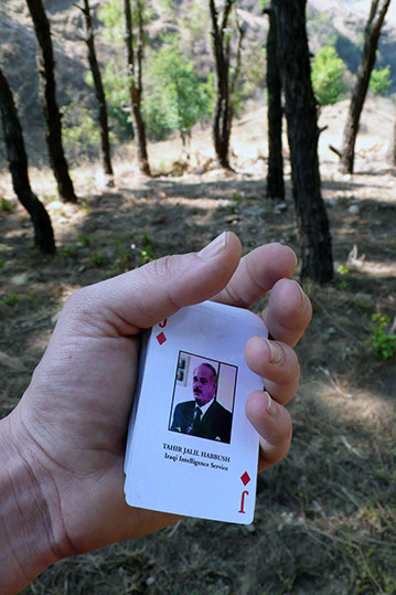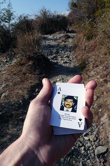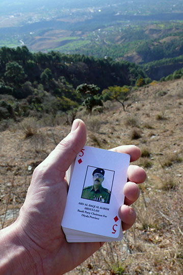 Série d’une vingtaine de photographies d’un jeu de cartes à l’effigie de grands dignitaires Irakiens, distribué par l'armée américaine pour traquer l'ennemi. Ces images montrent le jeu de carte manipulé avec en arrière plan des paysages probablement non irakiens, racontant l’histoire d’une quête en déroute.