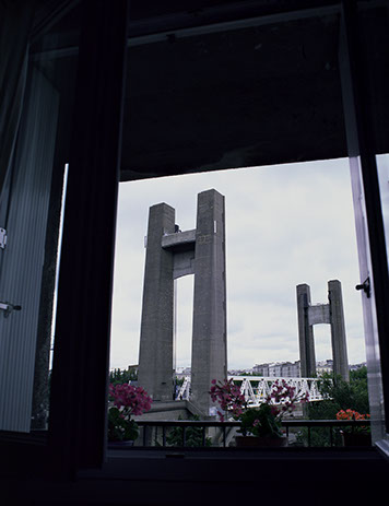 Série de photographies de fenêtres et balcons donnant sur l’Arsenal de Brest. Ces images montrent la situation absurde dans laquelle se trouvent nombre d’habitants de Brest dont les fenêtres donnent sur un complexe militaire qu’il est totalement interdit de photographier. Alain Declercq a, pour les besoins de ce travail, fréquenté les agences immobilières et visité de nombreux appartements à vendre ou à louer dont les fenêtres donnent sur l’Arsenal.