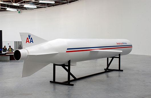 Réplique en résine d’un missile Tomahawk peint aux couleurs de la compagnie aérienne American Airlines. Alain Declercq s’est intéressé de près aux controverses portant sur le 11 septembre 2001, et en particulier aux thèses selon lesquelles un missile américain, et non un avion de ligne, aurait endommagé le Pentagone. "American Airlines" fut présentée alors que les États-Unis envahissaient l’Irak, contexte faisant passer l’attaque sur le Pentagone au second plan. Alain Declercq n’a jamais voulu apparaître comme un fervent défenseur des thèses conspirationnistes sur le 11 septembre, ce à quoi il n’a pourtant pas totalement échappé.