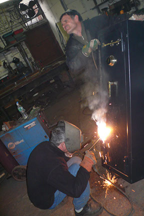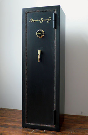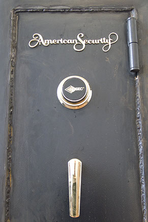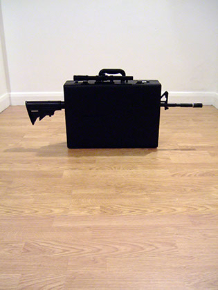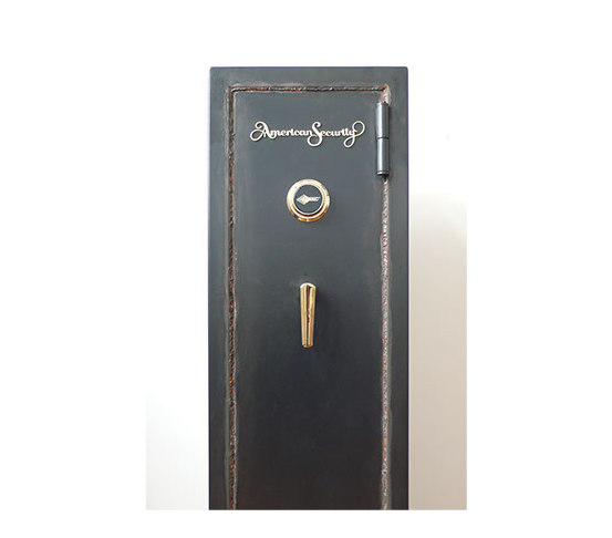 Coffre fort pour armes à feu, de marque "American Security", acheté aux États-Unis puis soudé. Cette sculpture se présente comme modèle particulièrement sécurisé de "safe guns".