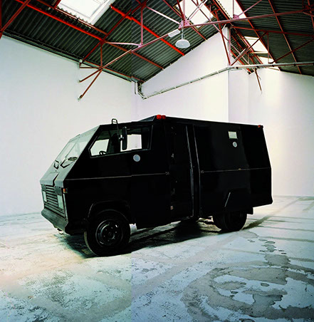 Fourgon blindé peint en noir et décoré de liserés dorés. Sculpture conçue comme le croisement entre un véhicule de transport de fonds et un corbillard. "Bang!" est une pièce évoquant à la fois le talon d’Achille des circuits financiers, le transport de fonds attisant fatalement la convoitise, et les hommes qui en assurent la protection, prolétaires du monde financier aussi paranoïaques que sur-armés.
