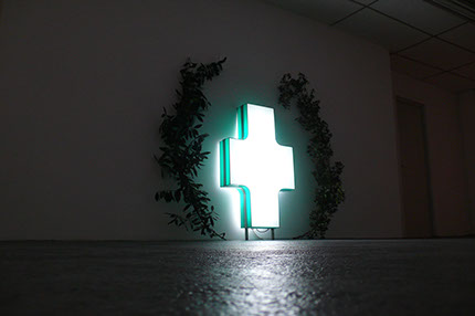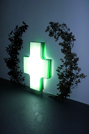 Sculpture constituée d’une croix de pharmacie lumineuse, d’une branche de laurier, et d’une branche de chêne. Mise en volume d’une partie du blason de la pharmacie des armées. Alain Declercq et Jeanne Susplugas ont fait se croiser là les deux principaux univers de leurs travaux, celui des armées d’un côté, celui de la pharmacopée de l’autre. "Blason" trouve dans la pièce Glaive son complément, une sculpture représentant l’autre partie du blason de la pharmacie des armées.