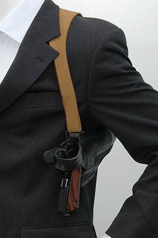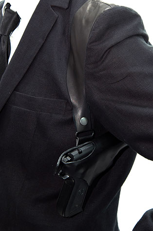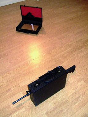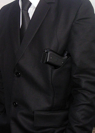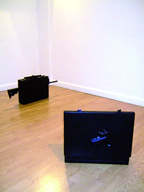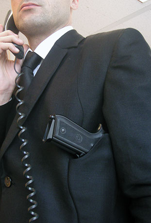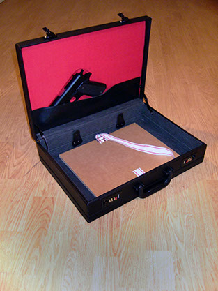 Série de deux attachés-cases rendant visibles, par déformation du cuir, des armes trop mal dissimulées.
