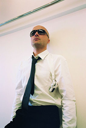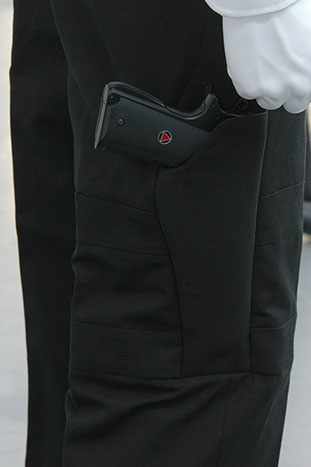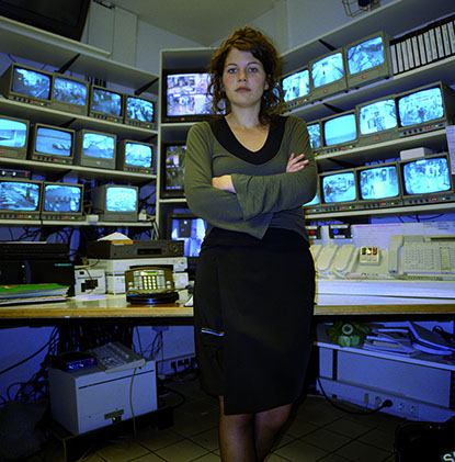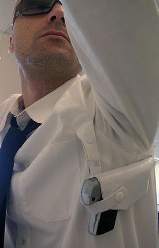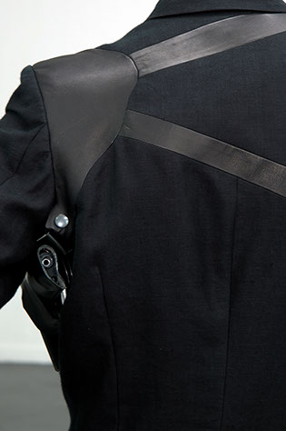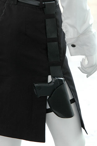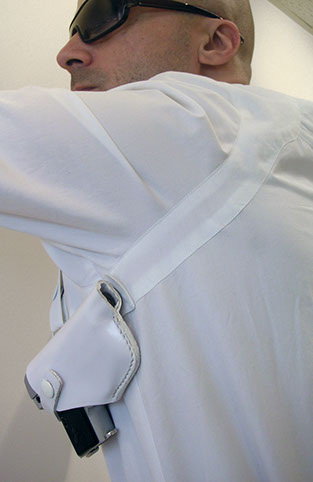 Six costumes pour hommes avec holster en cuir apparent, intégré sur l’endroit du vêtement. Photographie ci-contre présentant un de ces costumes porté par un modèle. GLASNOST FOR MEN est une pièce qui fut conçue en collaboration avec l’atelier de design I.E. qui a contribué à la modélisation et la confection de ces costumes. Trois modèles de tailleurs pour femme avec holster en cuir apparent, intégré sur l’endroit du vêtement. Photographie ci-contre présentant un modèle posant, holster sur la cuisse, dans la salle de contrôle du centre commercial jouxtant le centre d’art le Parvis. GLASNOST FOR WOMEN fut exposée en même temps que GLASNOST FOR MEN au Parvis, centre d’art de Tarbes où eut lieu un cambriolage durant lequel furent endommagés les vêtements et volées les fausses armes positionnées dans les différents holsters.