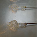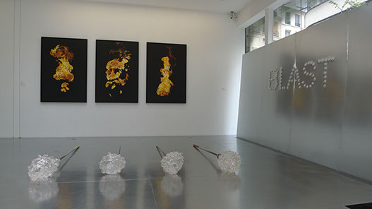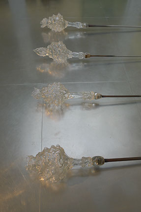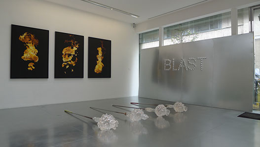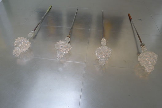 Réalisées avec des maitres verriers, ces sculptures sont constituées de cannes servant à souffler le verre sur lesquelles sont encore accrochées des formes rappelant des explosions. Une fois l'explosion sculptée dans le verre en fusion, l'artiste plonge sa pièce dans un récipient d'eau froide qui vient littéralement éclater la forme en verre comme pour la figer dans son opération de destruction.