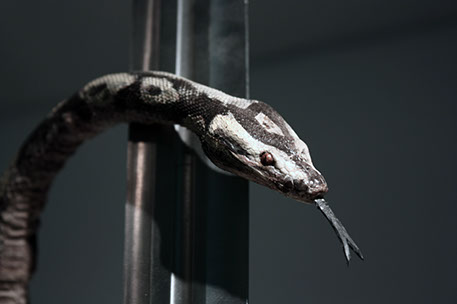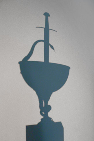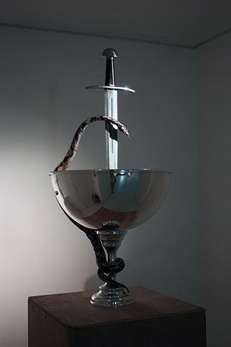 Sculpture constituée d’un serpent naturalisé comme enroulé autour d’une coupe et d’un glaive. Mise en volume d’une partie du blason de la pharmacie des armées en collaboration avec Jeanne Susplugas. "Glaive" complète la pièce Blason pour reconstituer la totalité du blason de la pharmacie des armées en trois dimensions.