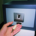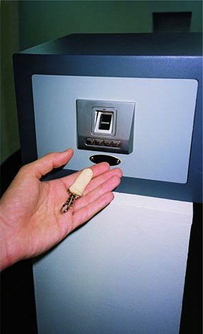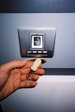 Coffre fort à reconnaissance digitale programmé pour fonctionner avec l’empreinte d’Alain Declercq et livré avec moulage en latex du doigt de l’artiste monté en porte-clés. "Safe" est un coffre dont l’ouverture peut potentiellement être activée par Alain Declercq qui peut ainsi reprendre possession sinon de son œuvre, du moins de son contenu.